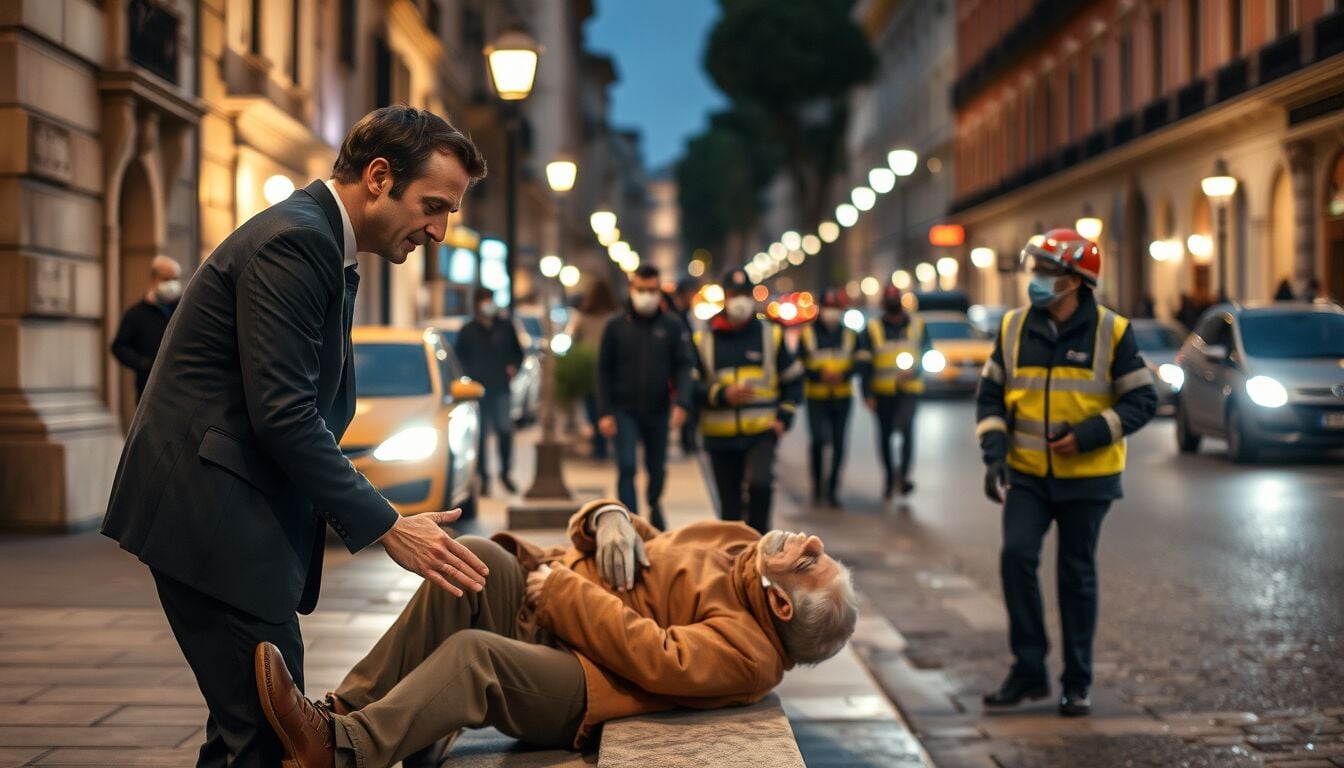 La scena si consuma rapidamente nel cuore di Via del Corso: Emmanuel Macron, circondato dalla scorta e da un folto seguito di collaboratori, nota un cittadino anziano accasciato su un gradino. Blocca il corteo e chiede ai suoi medici di intervenire, imponendo una pausa di circa un quarto d’ora.